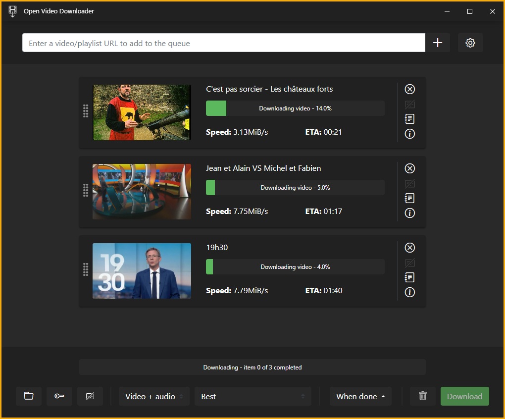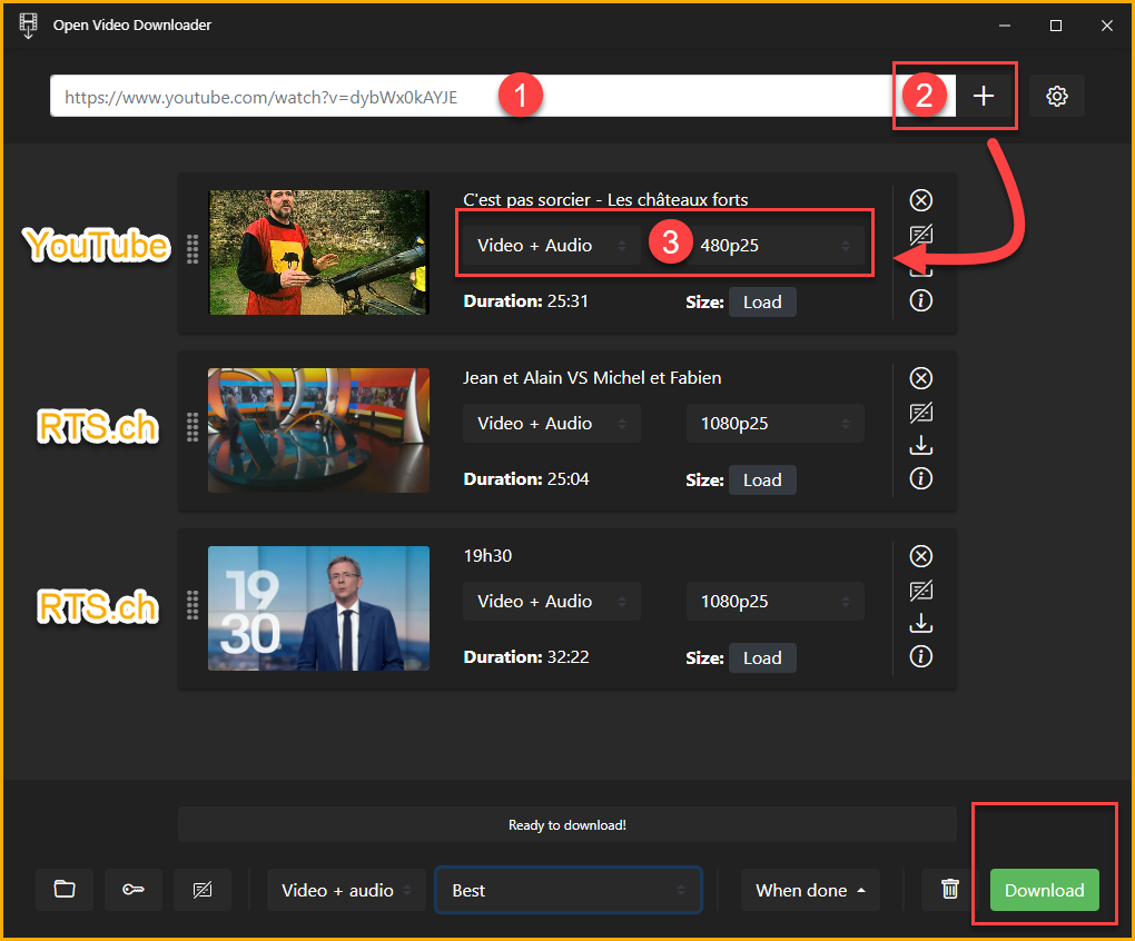 Renseignez le lien de la vidéo que vous souhaitez télécharger dans la barre d'adresse en haut, puis cliquez sur le bouton "+", vous pouvez charger plusieurs vidéos à la fois avant de les télécharger :