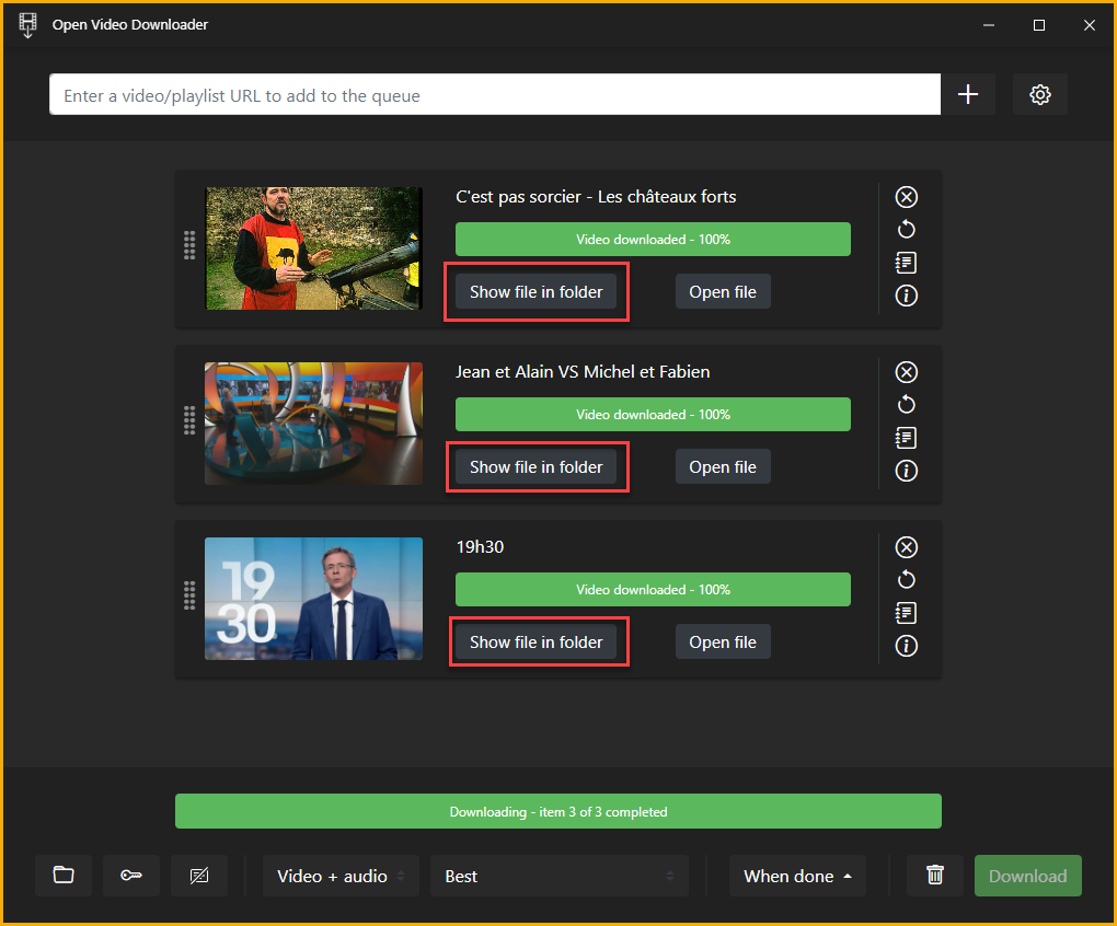 À la fin du téléchargement, vous pouvez cliquer sur "Show file in folder" afin de retrouver vos téléchargements (dossier par défaut) :