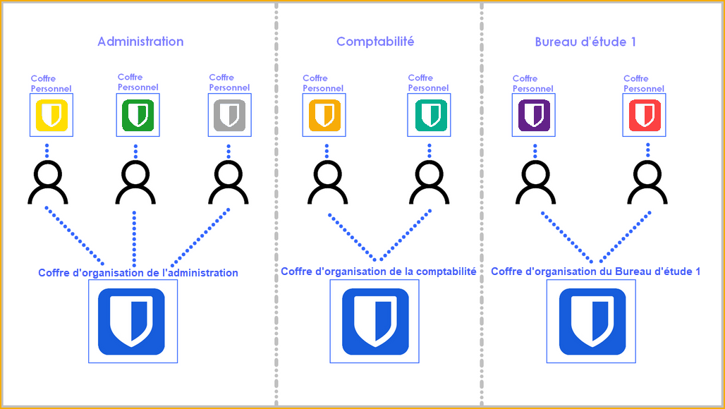 Dans cette exemple, trois organisations coexistent dans le même serveur Bitwarden, ces trois organisation mettent à disposition des identifiants pour leurs membres et chaque membre a son propre coffre personnel que seul lui peut déverrouiller.